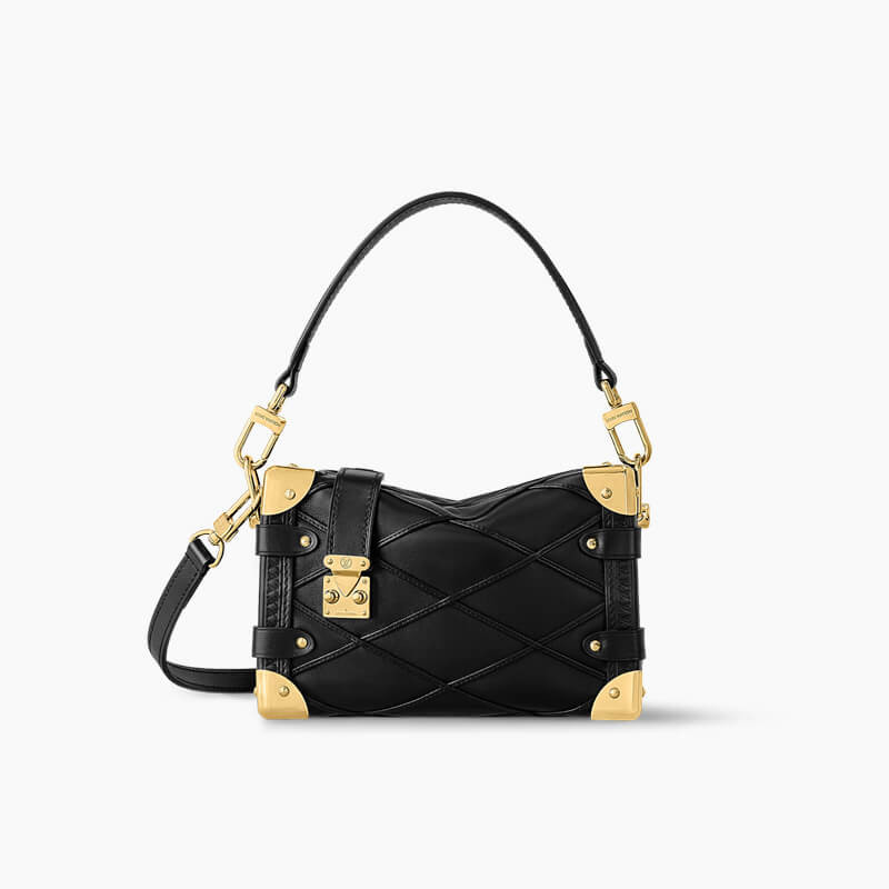 Fashioned from quilted lambskin, the Side Trunk PM handbag takes the House’s vintage trunks as its jumping off point. The boxy shape is embellished with gold-color hardware, including the reinforced corners and rivets. It closes with zipper attached to an S-lock. There’s a detachable and adjustable shoulder strap in addition to the removable top handle.